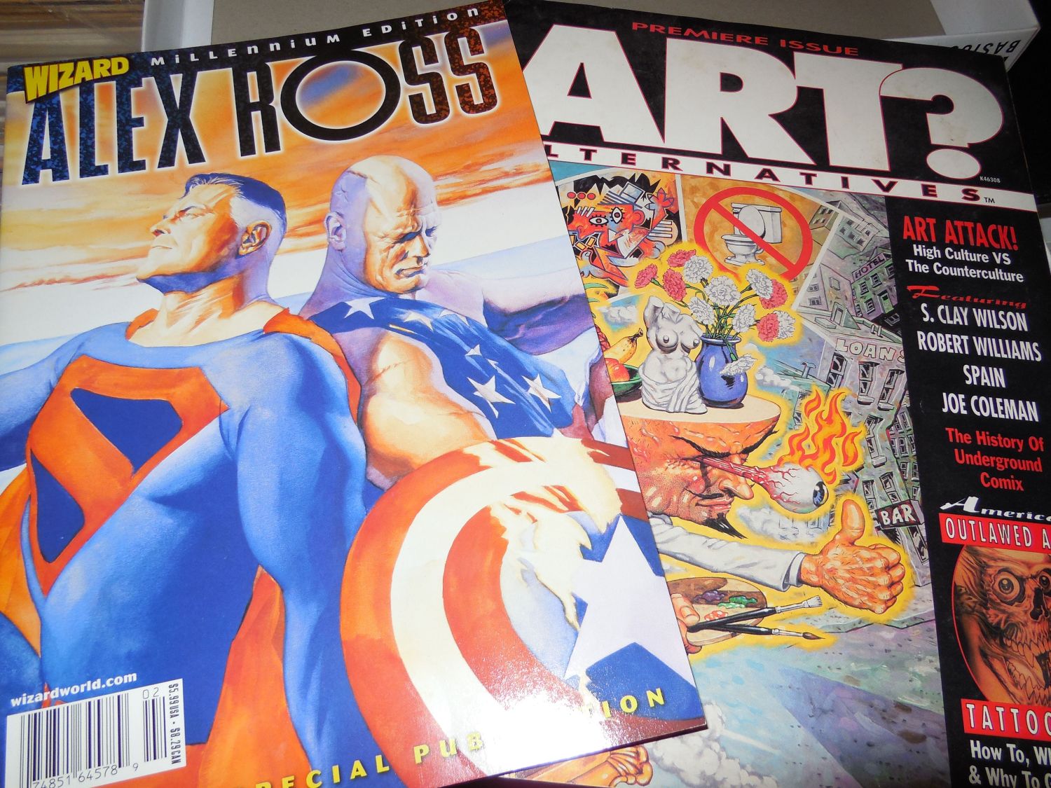 Seen below are the major inspirations for the painting, Alex Ross and Robert Williams. I turned to Ross for technique, as he's one of the few artists I know who's not afraid to work with straight black, and because I wanted to experiment with his style of underpainting. William, meanwhile, informed my sense of design and color choice. Although they may seem like an odd pairing, when I got into it, I discovered they were more alike than you'd at first realize. This is probably due to both having their roots firmly in the comic industry and bringing that perspective to their work.